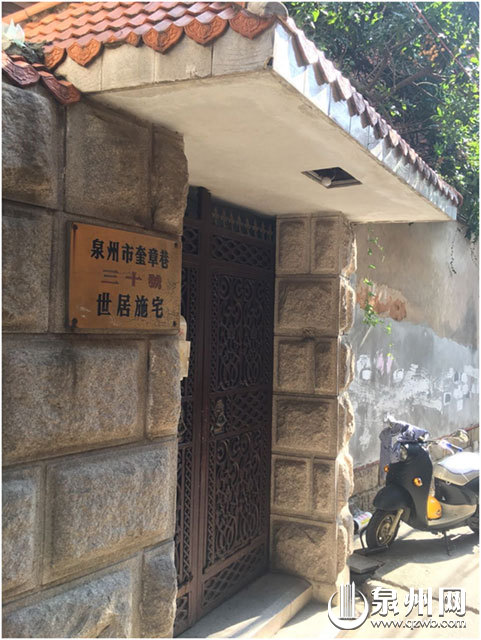 奎章巷30号是一座4层楼建筑,也是奎章巷的最高建筑,修建于1991年,门前有“世居施宅”的字样。楼顶东侧有两块石碑,写有“怀德”二字。据户主介绍,施氏最早从泉州石狮迁至奎章巷居住,并不太清楚是否为施琅的后代。上世纪80年代末,在菲律宾从事食品加工行业的亲戚,通过侨批汇款2万美元,由老宅翻建成此楼,因此立了“怀德”二字感念亲人。