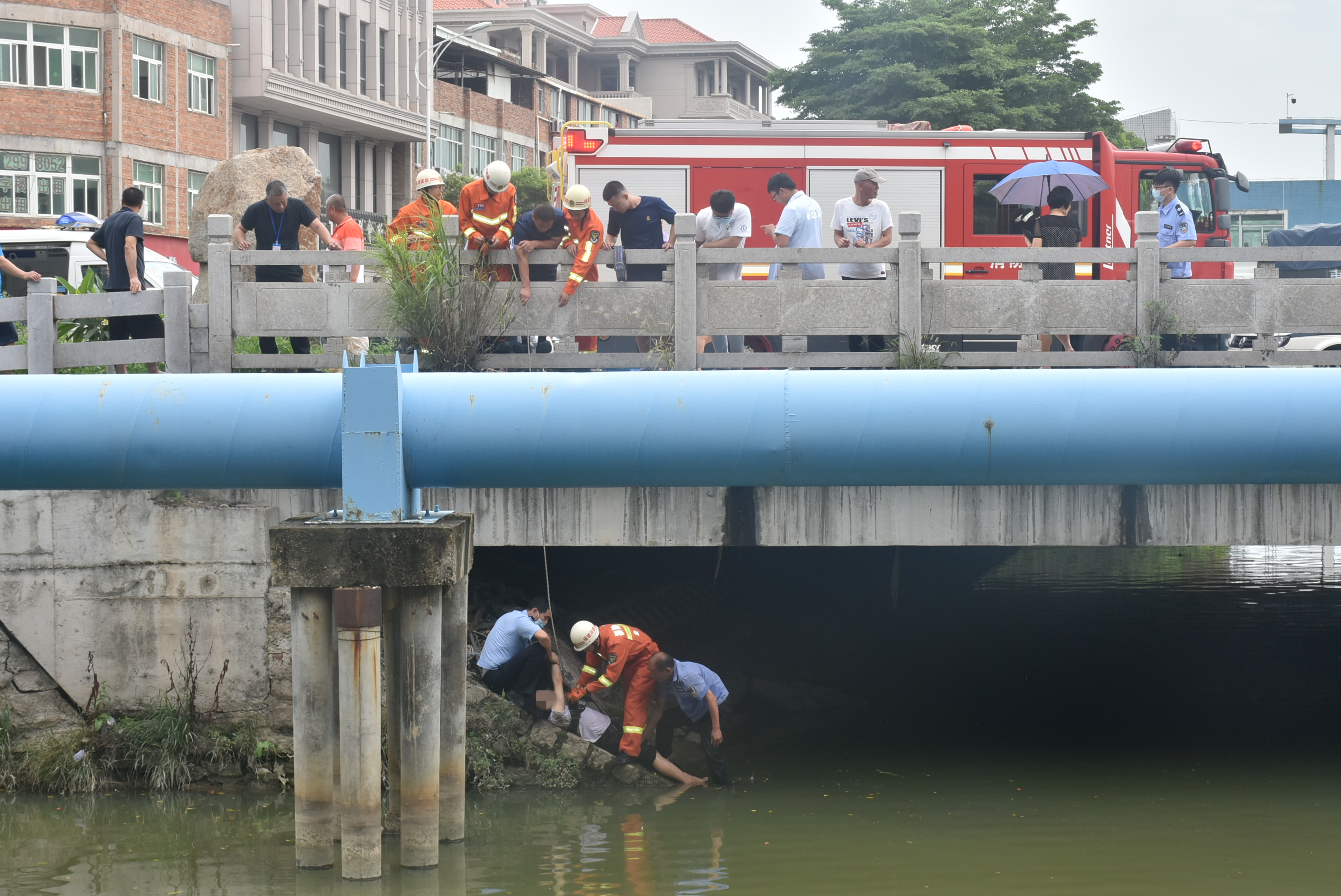 到达现场后,只见现场内沟河岸边围满了围观群众,事发地点又处于红绿灯交叉口,造成交通堵塞。此时内沟河桥下边,跳河女子已经被附近先赶到现场的巡逻队员从河里救了起来,人躺在河岸边的桥墩上,暂时无生命危险。由于该女子已处于昏迷状态,无法动弹,现场众人也无法将该女子抬到桥面上,只能焦急等待。