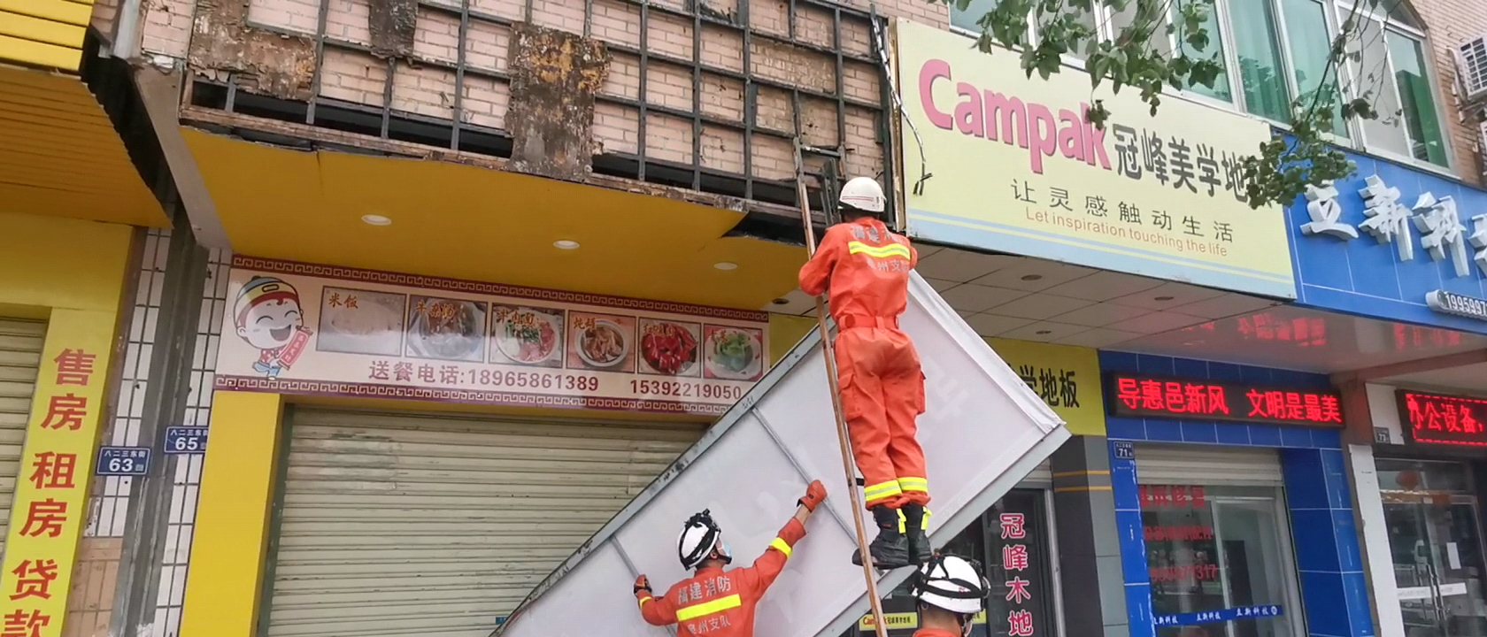 随后,在归队途中,消防员发现路口的一块广告牌被风吹得摇摇欲坠,广告牌悬挂在店面上,广告牌的金属支撑杆已经损坏,只剩下铁丝连接,随时有掉落的可能。一名消防员登高,在其他队员的帮助下,将广告牌成功取下。