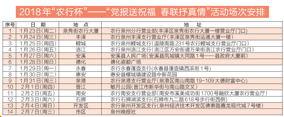 由泉州晚报社、中国农业银行泉州分行、泉州市文联联合主办,泉州市书法家协会、泉州市青年书法家协会、泉州市老年书画研究会、泉州晚报社书画研究院协办的2018年“农行杯”——“党报送祝福 春联抒真情”活动,将于下周二在中心市区泉秀街中国农业银行泉州分行营业部正式启动。今年准备了一万副春联,举办14场活动,书法家们将奔赴我市大部分县(市、区),现场书写饱含热情与祝福的春联,送给大家。□记者 谢宜萱 陈灵