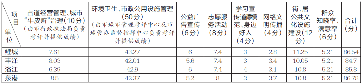 泉州网2月27日讯 (记者廖培煌 通讯员陈超永)昨日,泉州市创建全国文明城市工作指挥部公布,今年1月对鲤城区、丰泽区、洛江区、泉港区的占道经营管理等文明创建重点工作进行考评的成绩。