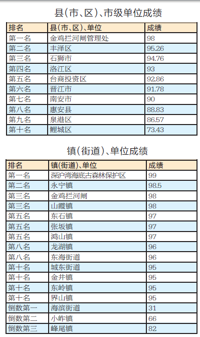 泉州网3月21日讯 (记者吴志明 通讯员郑培嵘)2月份,市城市管理综合考评中心对全市海岸带(近岸海域和海岸线向陆一侧200米的陆域)和晋江入海口至金鸡拦河闸上游100米的晋江河道环境卫生情况进行了考评。其中,在各县(市、区)、市级单位中,金鸡拦河闸管理处重新回到榜首,鲤城区倒数第一。而从各镇(街道)、单位成绩来看,深沪湾海底古森林保护区夺魁,海滨街道以31分名列倒数第一(具体成绩详见右图)。