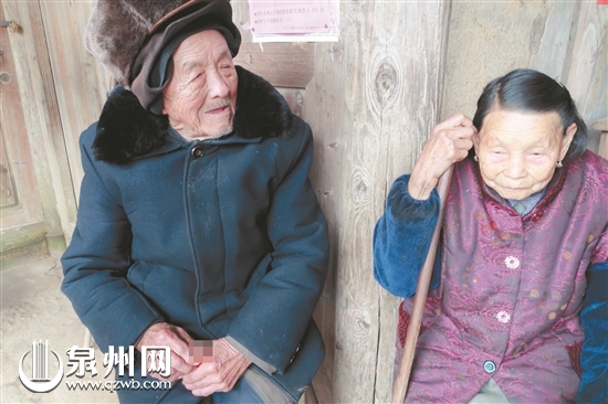 林老伯夫妻俩一直都生活在德化县盖德镇大乾村一座建于清代的百年老房子里。记者一行到来时,老两口正站在厅堂前,精神矍铄,一脸笑容。“我们都90多岁了,身体都还好,没有啥大毛病,就是眼睛不大好使。”看到记者目光落在二老的脸上,林老伯微笑地请我们进门,声音洪亮。