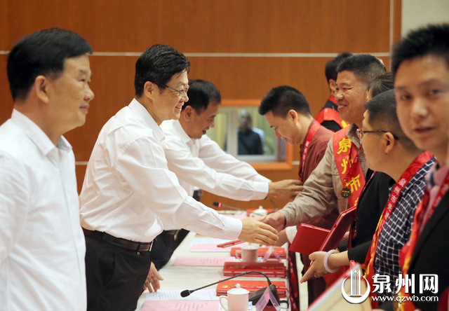 4月25日,泉州市庆祝“五一”国际劳动节暨表彰先进大会举行,市领导为获得泉州市劳动模范、泉州市先进工作者和泉州工匠荣誉称号的代表颁奖。图为市委书记、市长康涛与劳动模范握手。陈起拓 摄