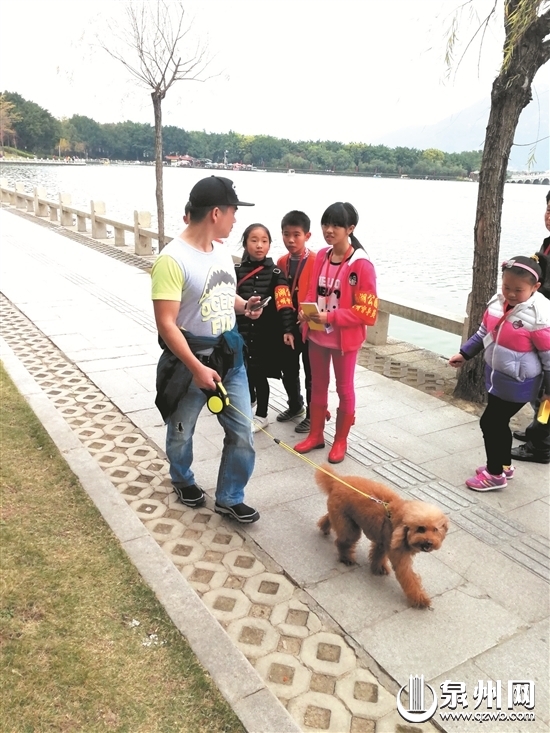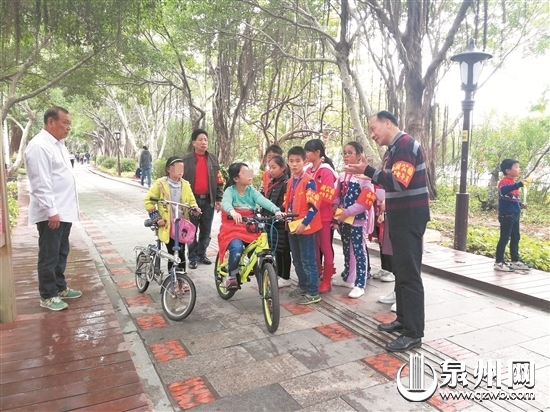 不少孩子骑单车进入公园,义务督导员及时劝阻。