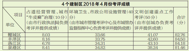 泉州网5月29日讯 (记者廖培煌)昨日,泉州市创建全国文明城市工作指挥部公布,今年4月对鲤城区、丰泽区、洛江区、泉港区的占道经营管理等文明创建重点工作进行考评的成绩。具体成绩见右边表格: