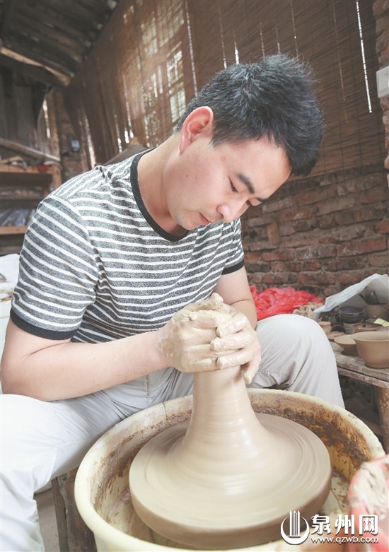 来自南平的黎志升已安家陶艺村多年。图为他在做手拉胚。