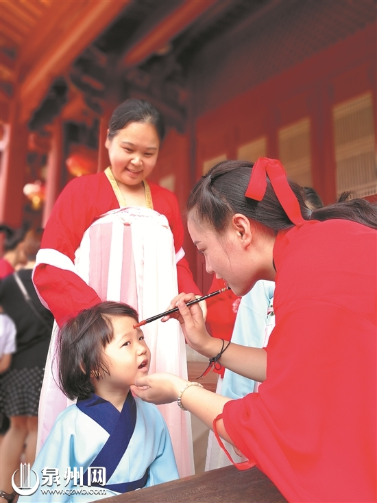 晋江龙泉书院过别样的端午节,家长和小朋友体验穿汉服、点雄黄。(李庆军 摄)