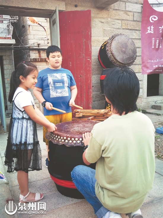 小长假期间,石狮永宁古卫城举办系列展览和端午节民俗活动,吸引了不少游客。图为小朋友学打节令鼓。 (林志党 摄)