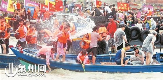 据了解,每逢端午节,石狮市要数蚶江镇最为热闹。据记载,“海上泼水节”最早见于明代,盛行于清朝,是泉州石狮蚶江和台湾鹿港对渡的文化产物,也是世界上唯一的“海上泼水节”。每逢端午节,两岸对渡的船只都要在蚶江海边追逐泼水,以这种欢快的方式互祝吉祥,交融情谊,并祈求平安兴旺。“海上泼水”的习俗由此产生并代代相传,成了全球仅有的民俗文化。