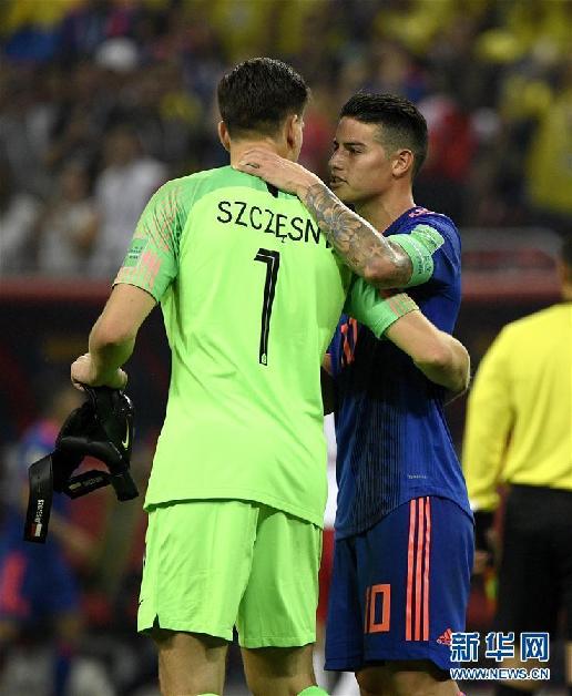 6月24日,哥伦比亚队球员哈·罗德里格斯(右)与波兰队守门员什琴斯尼在比赛后交流。当日,在喀山进行的2018俄罗斯世界杯足球赛H组小组赛中,哥伦比亚队以3比0战胜波兰队。 新华社记者吕小炜摄