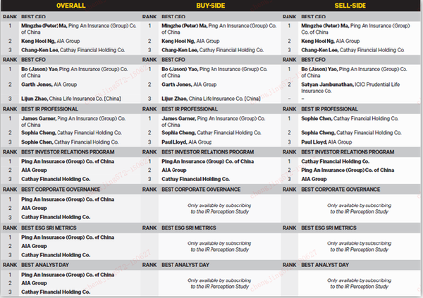 在此次亚洲保险行业类别评选中,中国平安董事长兼首席执行官马明哲获评“最佳首席执行官”、集团首席财务执行官姚波获评“最佳首席财务官”。此外,公司还在 “最佳投资者关系团队”、“最佳投资者关系主管”、“最佳公司治理”、“最佳投资者日”、“最佳ESG SRI指标”等多个单项评选中位列第一。平安银行在亚洲银行业类别评选中亦名列“最佳投资者日”前三甲。