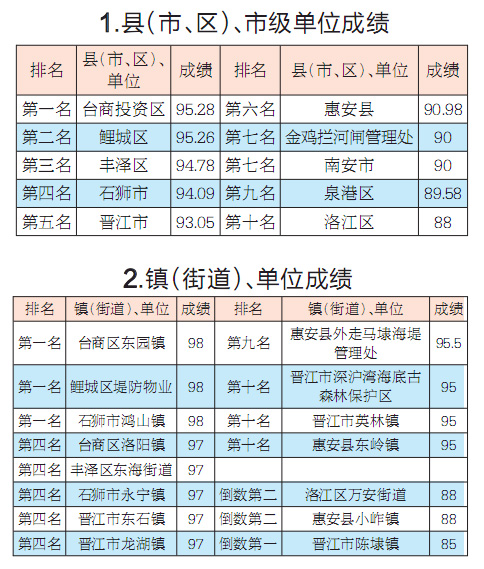 泉州网8月1日讯(记者吴志明 通讯员郑培嵘)6月份,市城市管理综合考评中心对全市海岸带(近岸海域和海岸线向陆一侧200米的陆域)和晋江入海口至金鸡拦河闸上游100米的晋江河道环境卫生情况进行了考评。其中,在各县(市、区)、市级单位中,台商投资区获得第一名,洛江区排倒数第一。而从各镇(街道)、单位成绩来看,台商区东园镇、鲤城区堤防物业、石狮市鸿山镇并列第一,晋江市陈埭镇排倒数第一,洛江区万安街道、惠安县小岞镇并列倒数第二。
