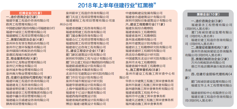 据统计,2018年上半年,住建部门共检查在泉住建企业493家,发出187份整改通知书,约谈9家企业,立案处罚2家企业;综合评价企业信用情况,生成上半年住建行业“红黑榜”,65家企业被列入“红榜”,10家企业被列入“黑榜”,5家企业被列为“黑名单”,通报表扬16家企业、5个建设工程项目,通报批评19家企业、1个建设工程项目。