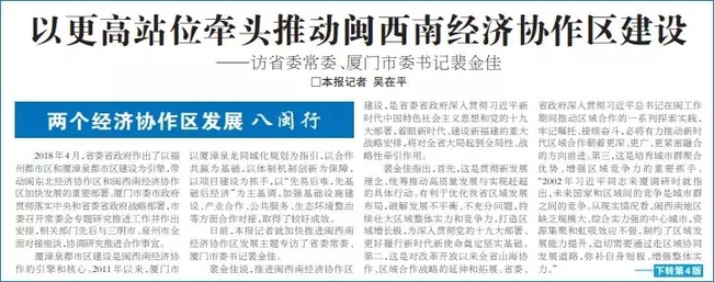8月20日,《福建日报》头版“两个经济协作区发展八闽行”栏目,以《以更高站位牵头推动闽西南经济协作区建设》为题,刊发了专访文章。