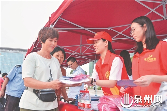 志愿者在扫黑除恶专项斗争活动宣传现场向群众分发材料 (林弘梫 摄)