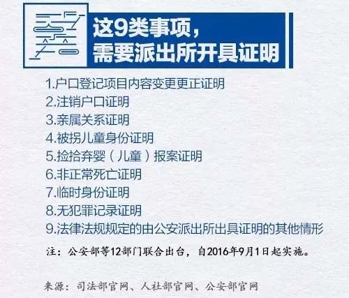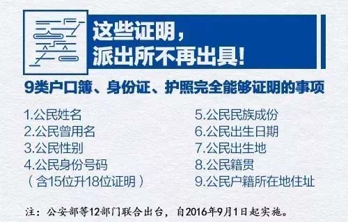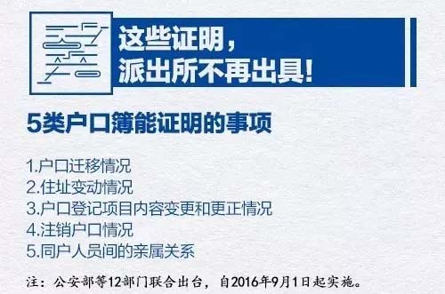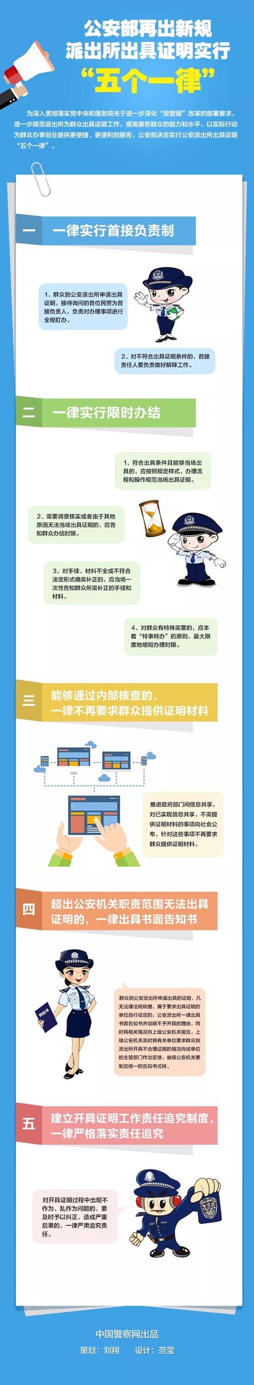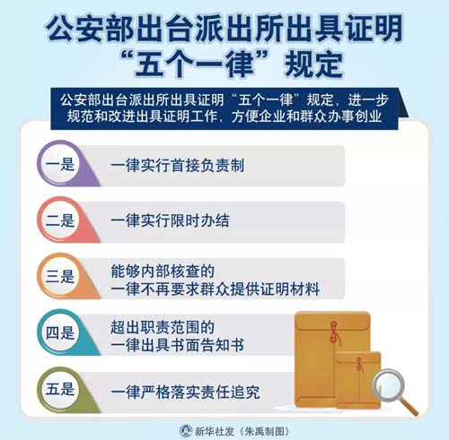 对此,公安部出台派出所出具证明“五个一律”规定,进一步规范和改进出具证明工作,方便企业和群众办事创业。