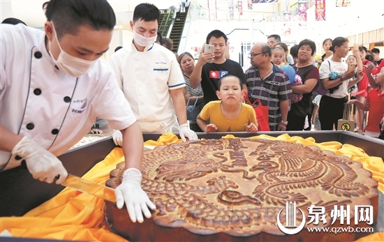 在活动的另一区域,一块厚15厘米、直径1.2米的大型一体式月饼吸引不少市民围观,得知可免费品尝,大家排起了长龙。糕点师傅将月饼切成一小块,分给市民食用。“这个双层蛋黄莲蓉月饼重达260斤,与其他拼接式的月饼不同,它是一体式的,因此成型技术难度大,我们也尝试了多次才成功。”活动承办方的工作人员介绍。