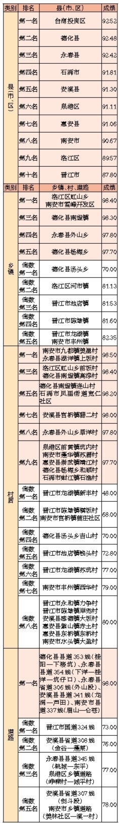 8月份,市城市管理综合考评中心抽评10个县(市、区)146个乡镇的325个村、104段道路及3个工业区环境卫生,主要成绩如下: