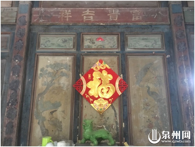 一楼大厅内,对联已遭严重涂毁,只有中间的6幅彩图仍可分辨,其中的孔雀、松鹤等瑞鸟形态古拙,栩栩如生。