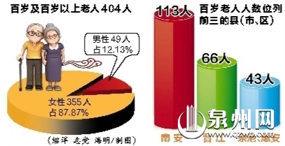南安、晋江的百岁老人人数居全市前两位,泉港、惠安并列第三 。全市百岁老人地区分布情况具体为:鲤城区19人(男性3人,女性16人);丰泽区12人(均为女性);洛江区4人(男性1人,女性3人);泉港区43人(男性8人,女性35人);石狮市16人(男性2人,女性14人);晋江市66人(男性10人,女性56人);南安市113人(男性8人,女性105人);惠安县43人(男性5人,女性38人);安溪县38人(男性4人,女性34人);永春县25人(男性3人,女性22人);德化县8人(男性3人,女性5人);泉州台商投资区17人(男性2人,女性15人)。百岁老人人数最多的乡(镇、街道)为南安水头镇,共有12人。