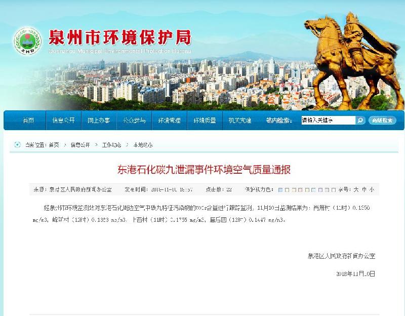 经泉州市环境监测站对东港石化周边空气中碳九特征污染物的VOCs含量进行跟踪监测,11月10日监测结果为:肖厝村(11时)0.1356 mg/m3, 峰前村(12时)0.1363 mg/m3, 上西村(11时)0.1755 mg/m3, 厝后四(12时)0.1447 mg/m3。
