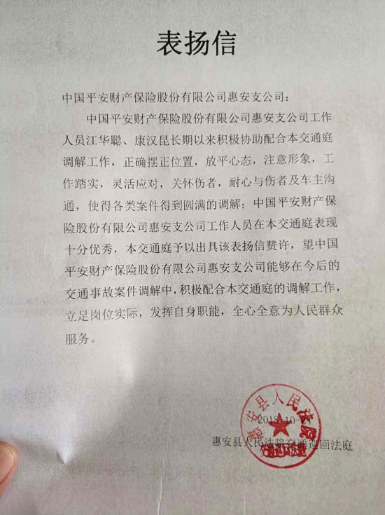 近日,平安产险惠安支公司收到了一封来自惠安县人民法院交通庭发来的表扬信,信中充分肯定了平安产险惠安支公司积极配合交通事故人伤调解工作,对平安产险惠安支公司一直以来提供的优质服务表示感谢,并对医疗查勘员江华聪、康汉昆提出了表扬、赞许。