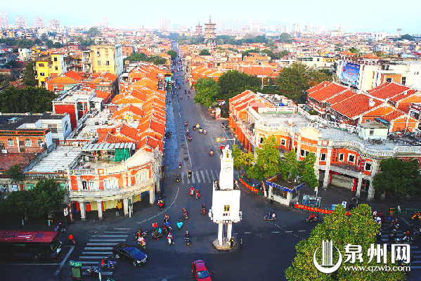 东海大街钟楼位于泉州东海大街,两旁建筑鳞次栉比,这条路是东海的“迎宾大道”。(陈起拓 摄)