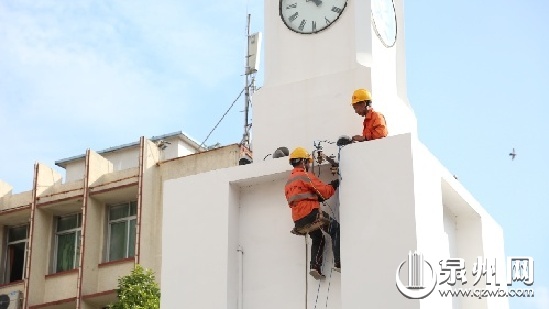 为了保证钟楼正常运行,市政部门专门指定人员定期上钟楼检查。图为市政工作人员对钟楼夜景亮化工程进行定期维护、检修。(苏维斯 摄)