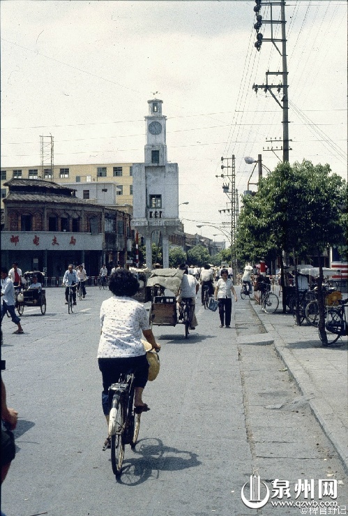 1986年,这张照片是自南往北拍摄的钟楼和已拆的泉州饭店。钟楼是古城重要的地理标志,东西街、南北路在此分界。