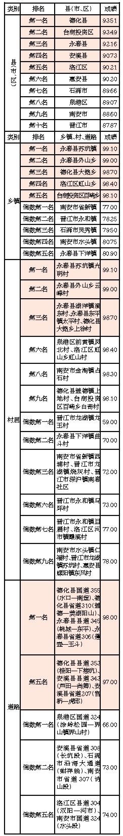 11月份,市城市管理综合考评中心抽评10个县(市、区)146个乡镇的324个村、105段道路及3个工业区环境卫生,主要成绩如下: