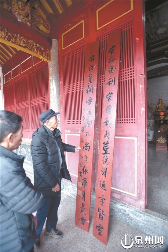 “听村里一些老人说,这对联是30多年前寺里失窃的。”戴云村党支部书记陈文庆说,“木刻对联被人盗走,后来翻修寺庙时,只能在石柱子上描金刻下这副对联。”