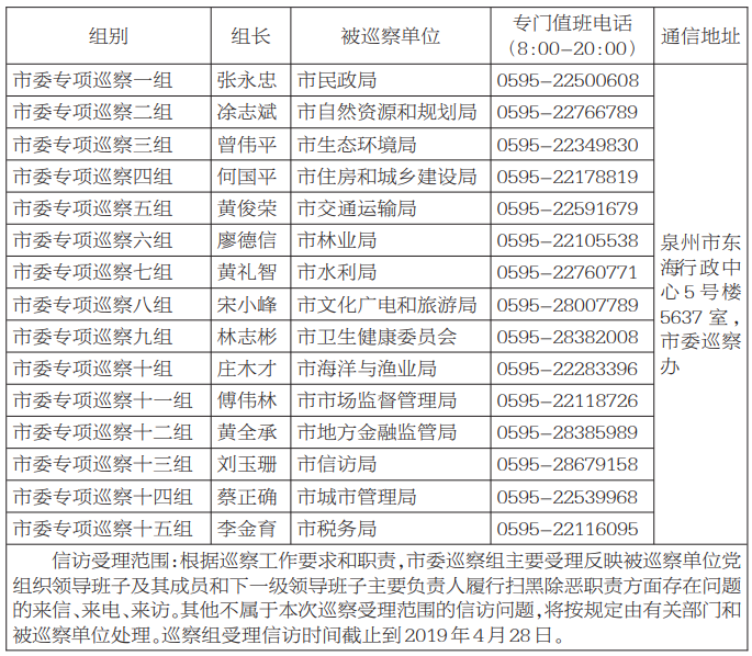 泉州网4月23日讯 (记者许雅玲 通讯员黄成玉)根据《中国共产党巡视工作条例》及中央、省委、市委关于巡视巡察工作的部署要求,经市委巡察工作领导小组同意,从2019年4月22日开始,对市民政局等15个市直重点部门党组履行扫黑除恶政治责任情况开展专项巡察。巡察时间一周左右。日前,15个巡察组已进驻被巡察单位。
