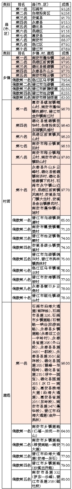 4月份,市城市管理综合考评中心抽评10个县(市、区)146个乡镇的323个村、105段道路及3个工业区环境卫生,主要成绩如下: