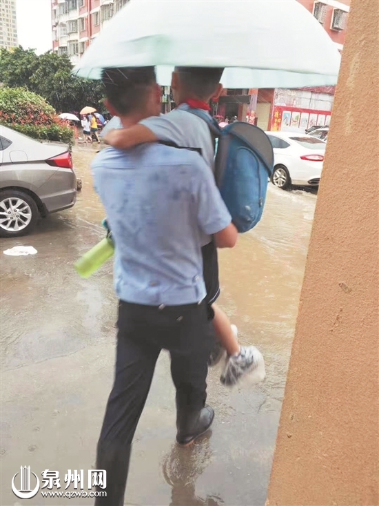 “当时积水最深大概有30cm,对于年纪小的孩子有点深了,我不仅是个交警,也是个当爸爸的,不忍心看到小孩子哭,就来来回回一个个抱过去,来回七八趟,有的小孩没带雨伞,我就送到校内,有带雨伞的,我就送到没积水的地方。”杨警官说。