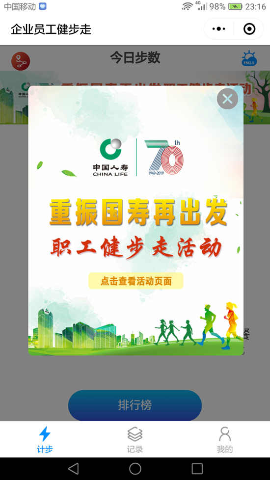 中国人寿保险(集团)公司工会此次活动以习近平新时代中国特色社会主义思想、党的十九大和工会十七大精神为指导,围绕贯彻落实《“健康中国2030”规划纲要》《全民健身条例》《全民健身计划(2016-2020年)》要求,以体育锻炼为手段,以思想建设为核心,以增强团队凝聚力和执行力、深化重振国寿的共识、激发重振国寿的激情为目标,组织全系统职工使用微信小程序,采取个人赛和团队赛相结合的方式,让广大职工走起来、跑起来、赛起来,并根据总步数的完成进度宣传展示重振国寿的战略部署,激发全系统职工积极投身到重振国寿的各项目标任务中去,以昂扬的激情、优异的成绩,庆祝新中国成立70周年和中国人寿建司70周年。
