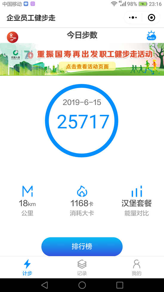 2019年6月1日,中国人寿保险(集团)公司工会在全国系统职工队伍中开展“重振国寿再出发”职工线上健步走活动,受到系统员工的积极响应,迅速掀起健身活动热潮。