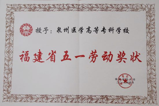 2019年4月25日,福建省总工会发布《关于表彰2019年福建省五一劳动奖和福建省工人(五一)先锋号的决定》闽工[2019]46号文,泉州医学高等专科学校荣获“福建省五一劳动奖状”。