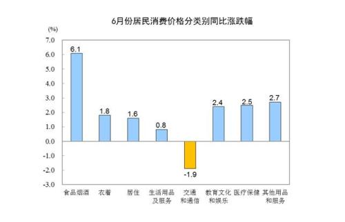6月份,食品烟酒价格同比上涨6.1%,影响CPI(居民消费价格指数)上涨约1.79个百分点。其中,鲜果价格上涨42.7%,影响CPI上涨约0.71个百分点;畜肉类价格上涨14.4%,影响CPI上涨约0.59个百分点(猪肉价格上涨21.1%,影响CPI上涨约0.45个百分点);禽肉类价格上涨7.4%,影响CPI上涨约0.09个百分点;鸡蛋价格上涨6.1%,影响CPI上涨约0.03个百分点;鲜菜价格上涨4.2%,影响CPI上涨约0.10个百分点;粮食价格上涨0.6%,影响CPI上涨约0.01个百分点;水产品价格下降0.5%,影响CPI下降约0.01个百分点。