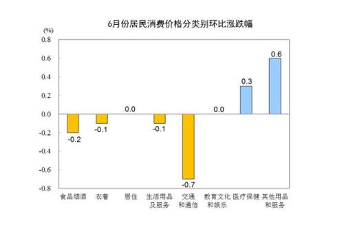 6月份,全国居民消费价格环比下降0.1%。其中,城市下降0.1%,农村下降0.2%;食品价格下降0.3%,非食品价格下降0.1%;消费品价格下降0.2%,服务价格上涨0.1%。
