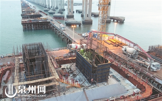福厦客专泉州湾跨海大桥主墩的首节塔柱昨日完成浇筑,图为施工现场。(李然犀 张九强 摄)