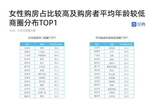 以北京为例,在交易最活跃的10大商圈中,年轻购房者扎堆在回龙观,平均年龄为34.3岁;而常营则吸引了更多的女性购房者,占比达到49.8%。