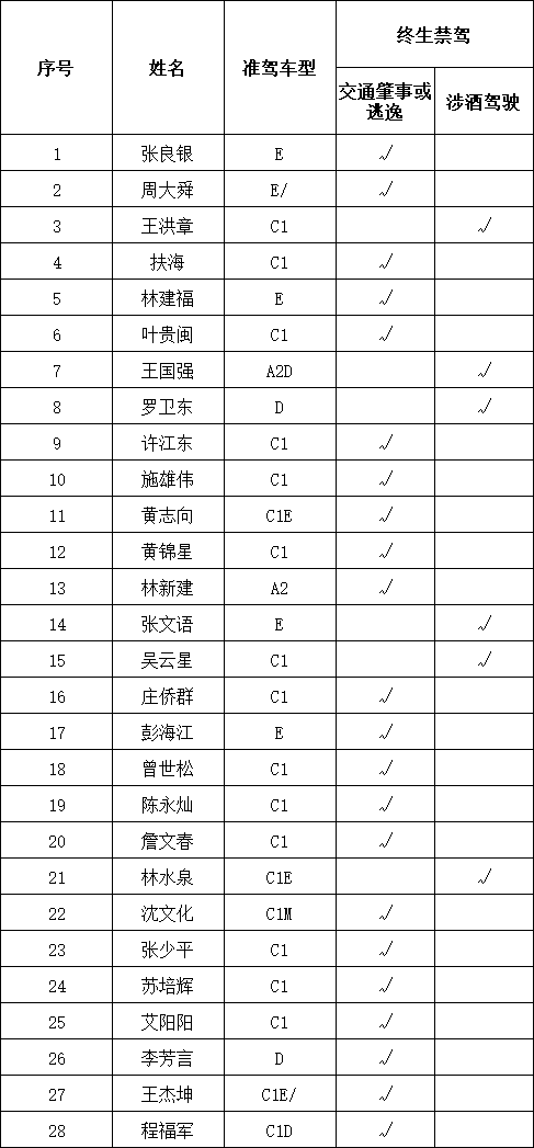 泉州网7月26日讯(记者卢珊珊 通讯员蒋国栋)26日上午,泉州交警部门召开新闻通气会,公布2019年上半年的终生禁驾人员名单,据统计,全市共有28人被终生禁驾。
