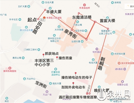 丰泽交警大队立即组织警力对该车可能逃窜路线进行布控拦截。嫌疑车辆一路疾驰,沿泉秀街行驶后左拐进入运通路,随后沿津霞街、南淮路行驶再次绕回到泉秀街,再次进入运通路后右拐到刺桐路,在刺桐路泉秀街路口,车子直接闯红灯驶过,一路上可谓险象环生。