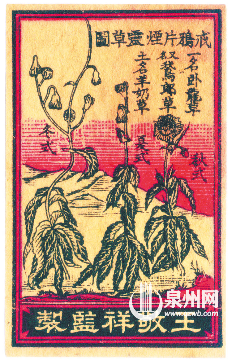 一清末商标上,画了戒鸦片草药在夏天、秋天、冬天的不同形态,方便人们按图索骥。商标上方写着“戒鸦片烟灵草图”“一名卧龙草,又名鹅郎草,土名羊奶草”,下方写“王敬祥监制”。据了解,王敬祥,出生于泉州金门,为旅日华侨。