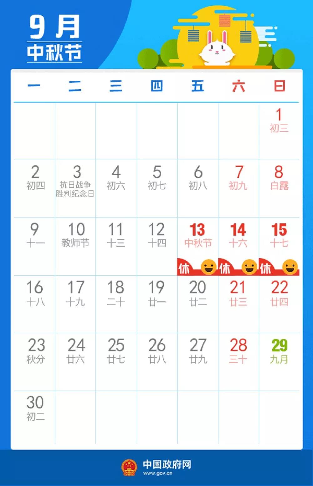 根据《国务院办公厅关于2019年部分节假日安排的通知》,今年中秋节正好赶上周五,与周末连休,不用挪假调休。