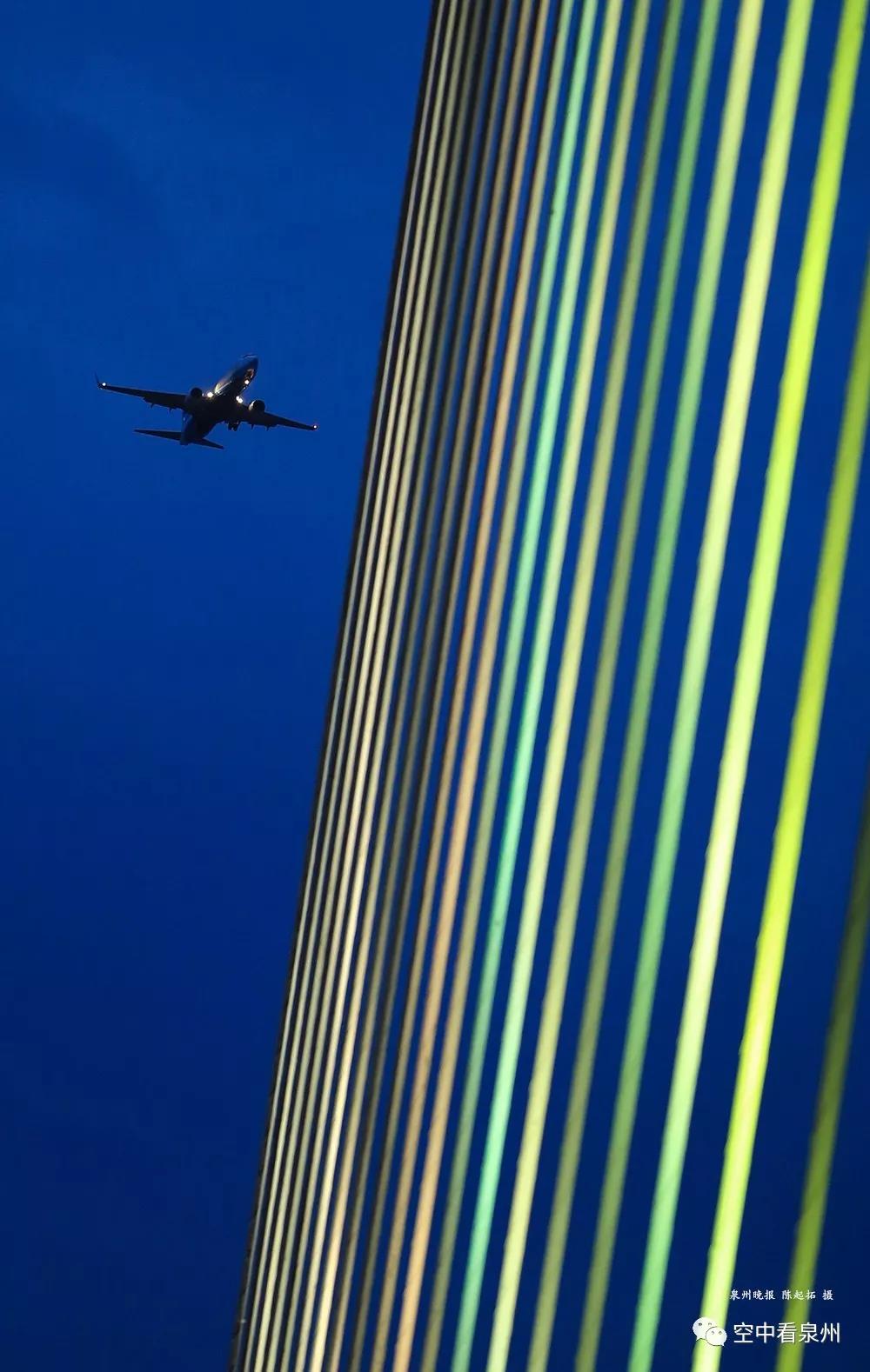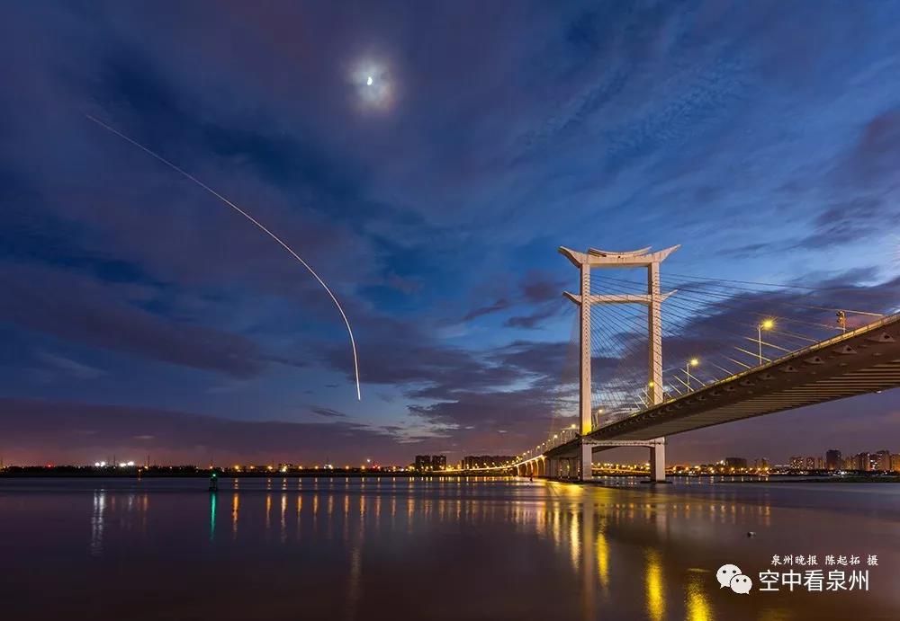 月亮,大桥,从泉州晋江机场起飞的航班留下长长的轨迹,共同描绘与众不同的一幕。