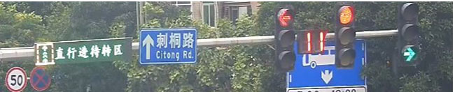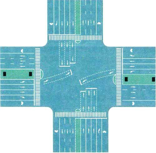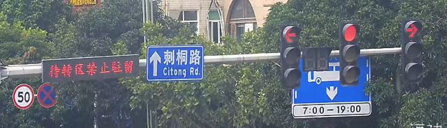 如图:与左弯待转区的设置相似,直行待行区线置于斑马线前,由白色虚线、停止线和导向箭头三部分组成。直行待行区需与诱导屏结合,由诱导屏提示进入待行区。