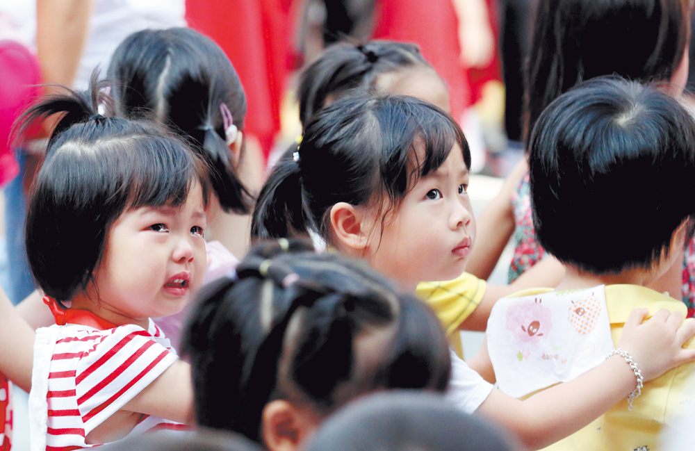 离开熟悉的家人,大部分孩子在老师们的带领下开心地玩起了教室里丰富多彩的玩具,也有个别孩子不适应新环境开始“哭鼻子战役”。