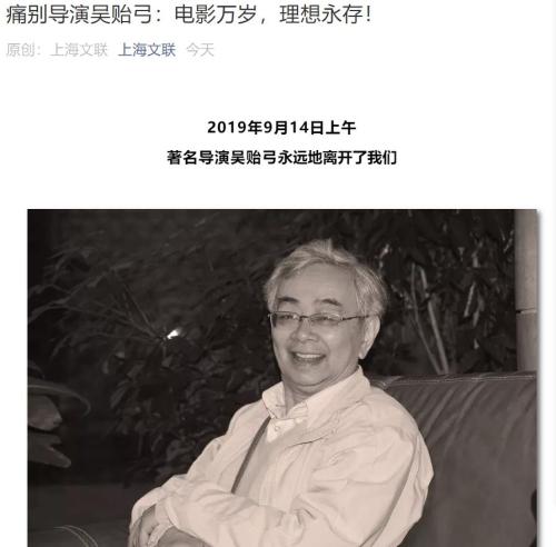 中新网客户端北京9月14日电(记者 宋宇晟)中国第四代导演、原中国文联副主席、中国电影家协会名誉主席吴贻弓9月14日在上海去世。